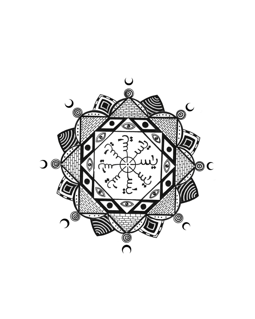 The interplay of textures — from woven crosshatches to wave-like curves — amplifies the mandala’s rhythm, while the repetition of sacred forms imbues the piece with meditative energy. Altogether, the artwork merges cosmic geometry, Islamic calligraphy, and archetypal symbols into a visual prayer, evoking cycles of life, death, and renewal under the watchful guidance of divine presence.