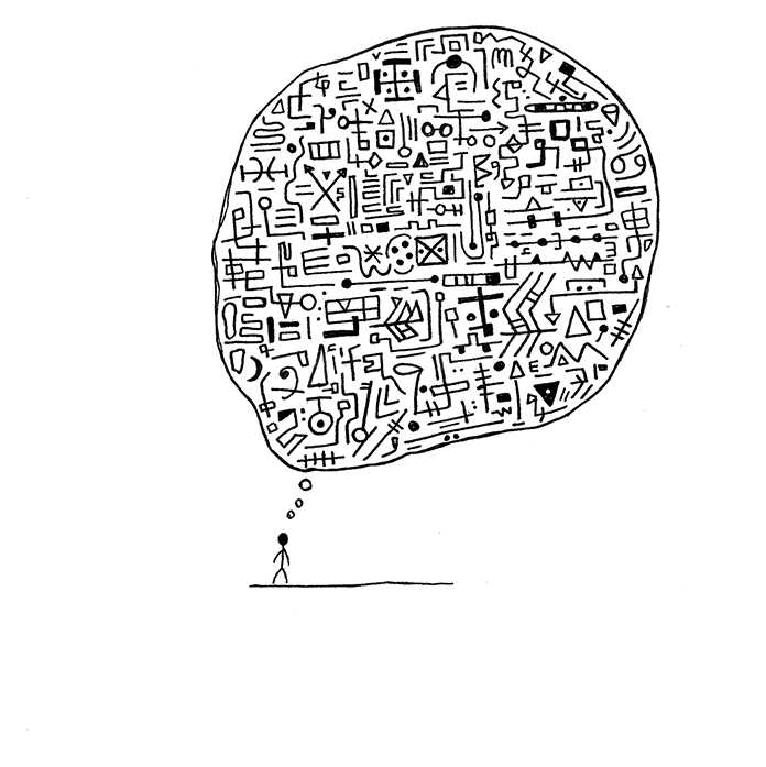 A tiny figure, alone, stands beneath an enormous cloud of symbols, signs, and fragments — the unspeakable pressing against the limits of speech.